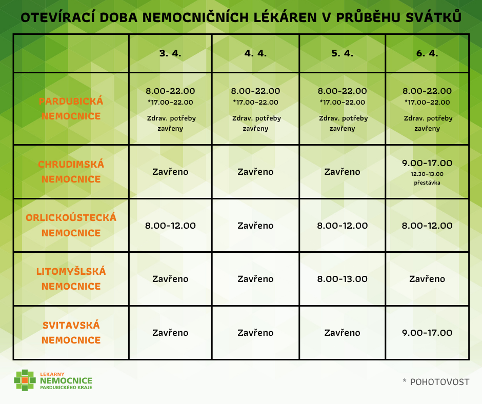 Během následujících velikonočních svátků budou mít nemocniční lékárny upravenou otevírací dobu.