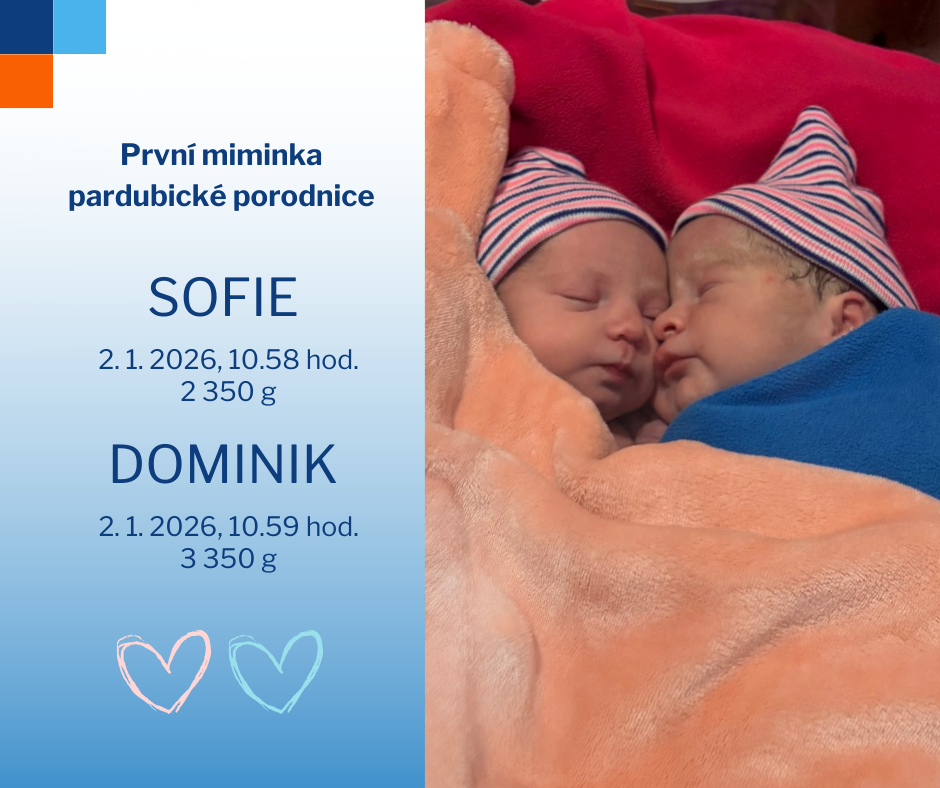 Jako poslední z porodnic Nemocnice Pardubického kraje přivítala svá první miminka Pardubická porodnice – a hned dvojčátka. Dne 2. ledna 2026 se v rozmezí jediné minuty narodila holčička Sofie (10:58, 2 350 g) a chlapeček Dominik (10:59, 3 350 g, 51 cm). Rodina bydlí ve Starém Máteřově.