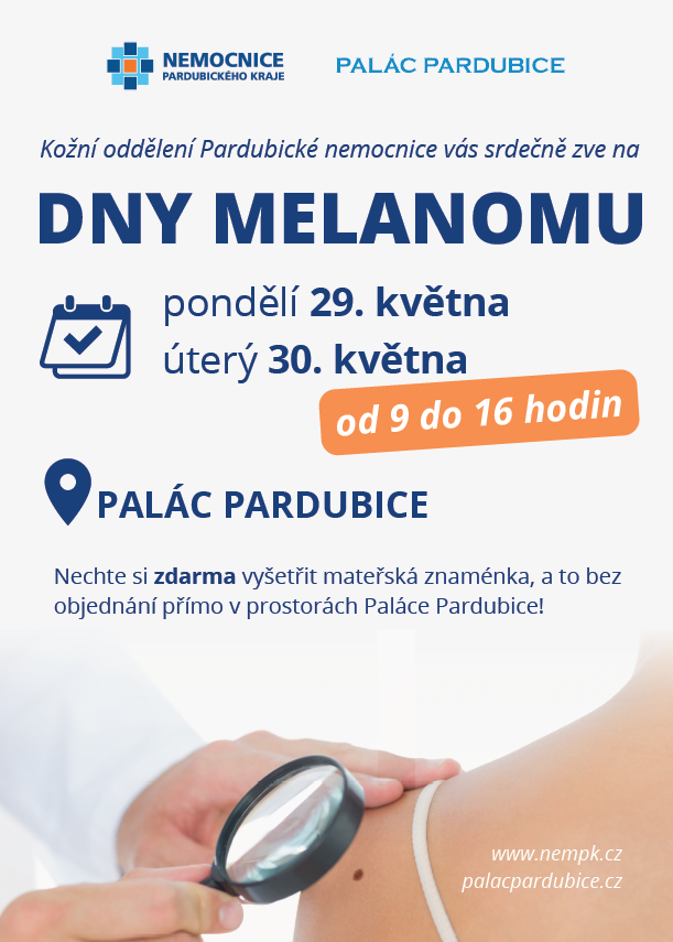 Kožní oddělení Pardubické nemocnice se rozhodlo i letos připojit k osvětové akci Evropský den melanomu. Při této příležitosti nabízí možnost nechat si zdarma vyšetřit mateřská znaménka, a to bez objednání přímo v prostorách Paláce Pardubice. Dny melanomu se zde uskuteční v pondělí 29. a v úterý 30. května 2023, vždy od 9 do 16 hodin.